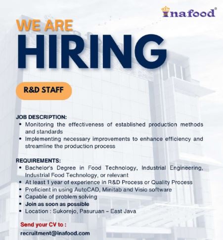 - S1 dari jurusan teknologi pangan, teknik industri, atau teknik pangan industri atau yang relevan.