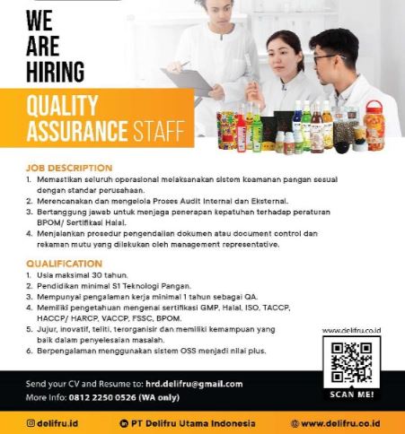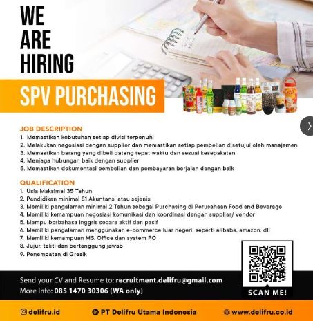 Kalau tertarik dengan lowongan kerja di Jawa Timur ini, kamu bisa mengirim surat lamaran via email recruitment.delifru@gmail.com dengan Subject : Posisi_Nama_Domisili. Bisa pula kamu lamar lewat barcode di gambar.