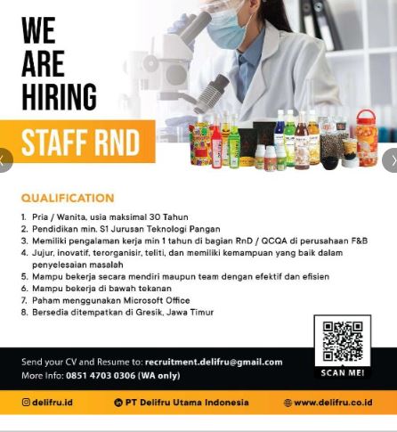 PT Delifru Utama Indonesia Gresik yang merupakan perusahaan dalam F&B dengan produk utama berupa bubuk serta sirup minuman, tengah membuka lowongan kerja terbaru. Saat ini, ada beberapa posisi yang bisa kamu lamar di perusahaan ini. Ada yang untuk lulusan SMA/SMK lho.