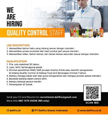 - Pendidikan minimal SMA/SMK jurusan analis kimia atau pengalaman bidang QC minimal 1 tahun